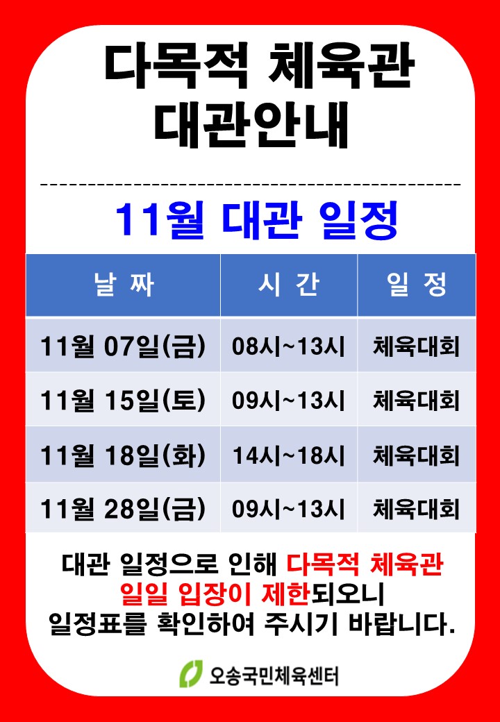 11월 다목적체육관 대관일정 안내