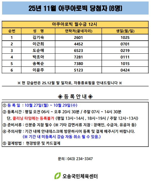 11월 아쿠아로빅 신규회원 당첨자 명단 (6명)