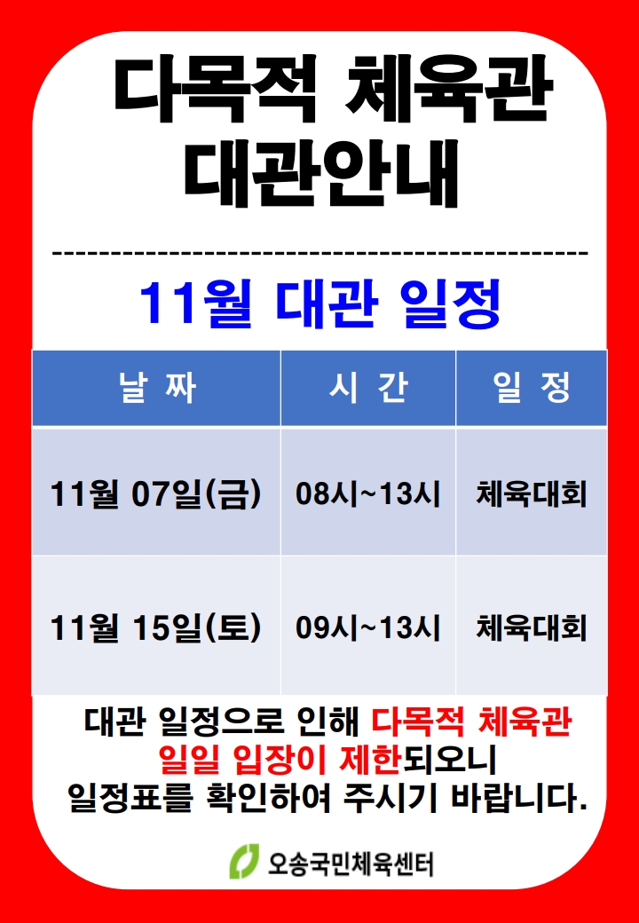11월 다목적체육관 대관일정 안내